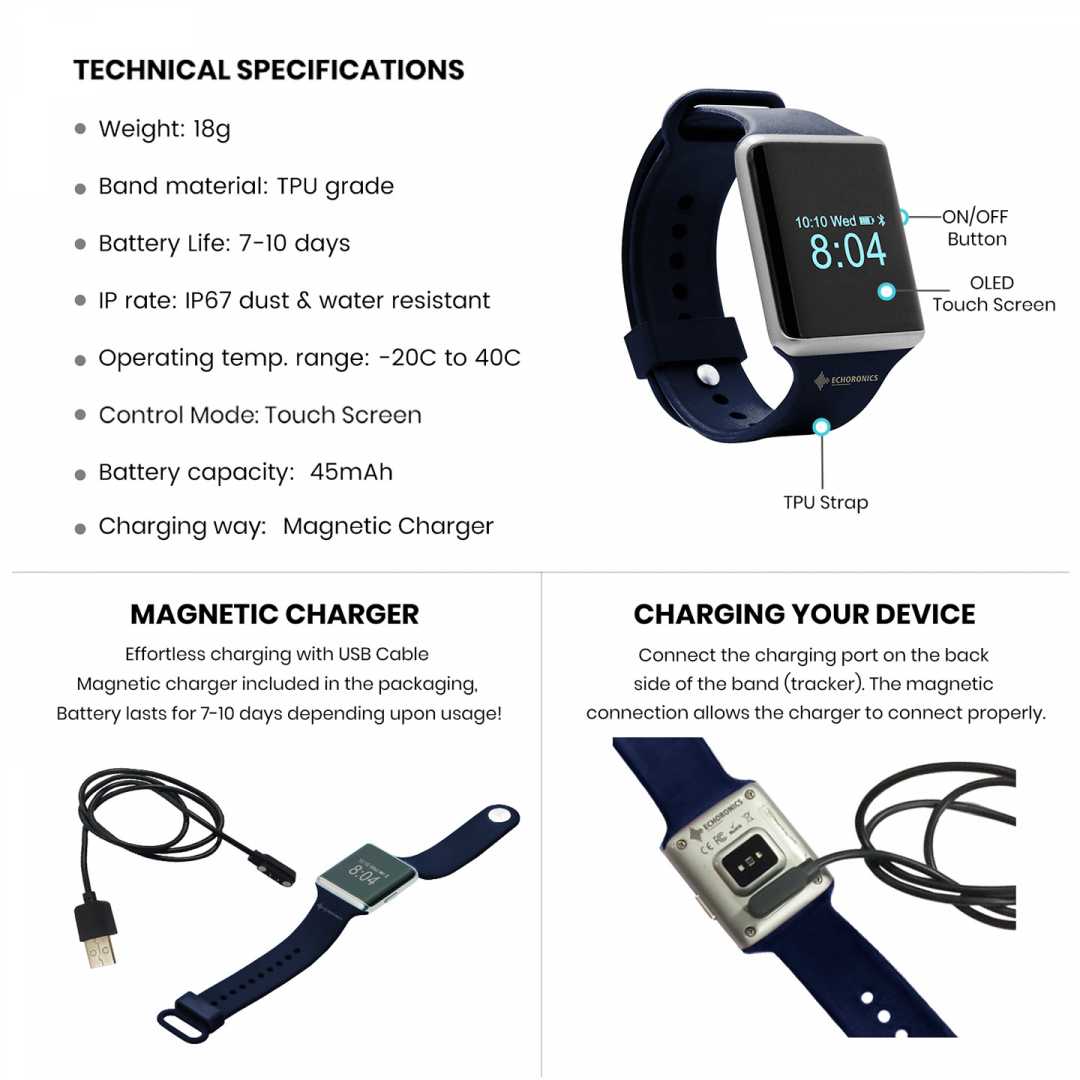 Weight 18gms; Battery life 7-10 days; TPU Strap; Magnetic Charger for Fast Charging; Long battery life