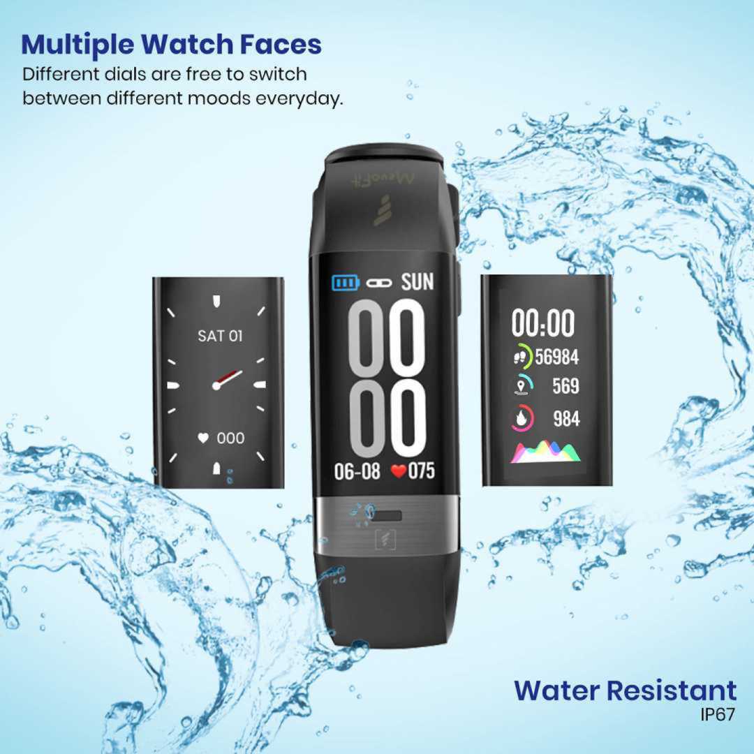 Along with being your health and fitness companion the fitness band also comes with smart features including clock, alarm, vibration, reminders, weather, timer, stop watch, find phone, gesture control.
